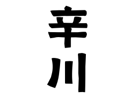 ②コリア(朝鮮・韓国)系。推定での比率は1%以下。地形。辛に「川」を追加。福岡県北九州市(旧:門司市)で1962年2月23日に帰化の記録あり。本姓は辛。辛参照。